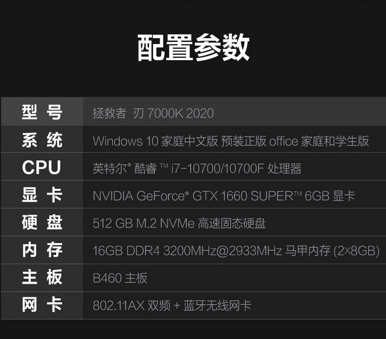 联想(Lenovo)拯救者 刃7000K 新品十代酷睿 i7 UIY吃鸡电竞游戏设计台式电脑主机(I7-10700 16G 512GB GTX1660Super 6G )