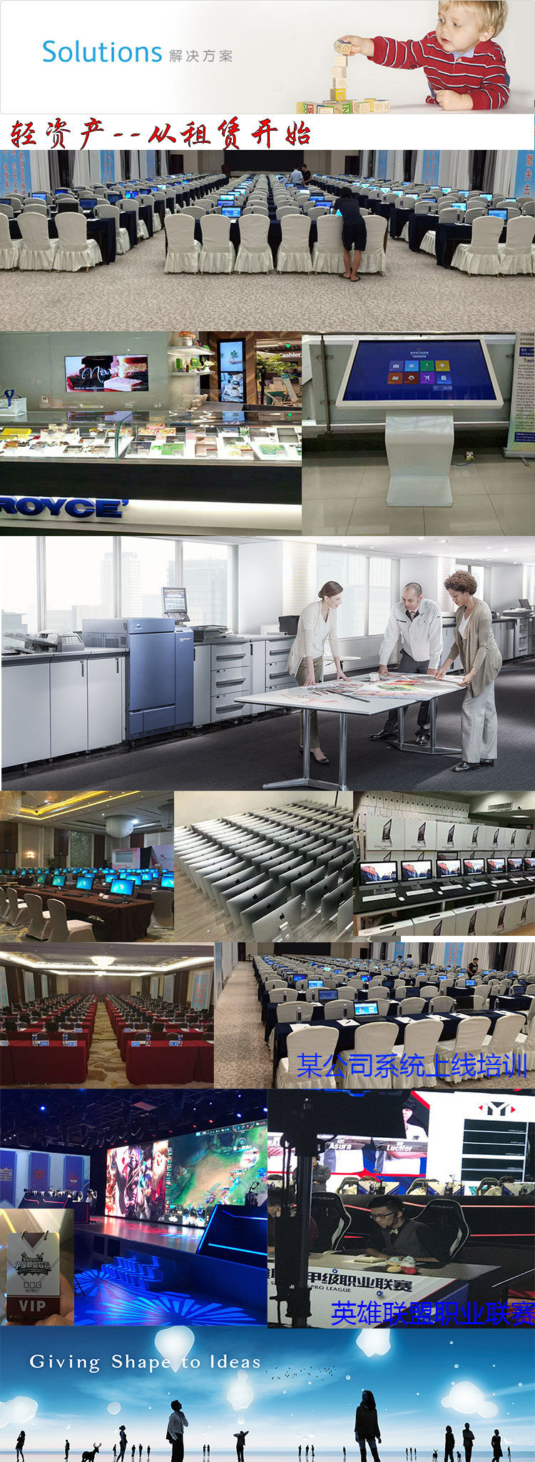 上海电脑租赁公司在这里我悄悄告诉你!凡是我们租赁的产品,都是经过我们精挑细选的,商品质量都可以得到保障。商家敢销售劣质假冒产品,单若是租赁的话,谁都不敢也不愿购买劣质假冒商品来出租。 所以租客不必担心产品质量和售后问题。企租网坚持的一个原则是:租金不高于使用价格(购买价减去用后残值),让你租的实惠,押金不高于产品购买价,让你租的放心。 想租东西,就到企租网。租是一种服务,租福你,租富你,是我们的服务理念。 对于通情达理,友好大方的客户,爱租吧将邀请您成为会员共享俱乐部创始成员,共享企租网全部资产的所有权,收益权,使用权。