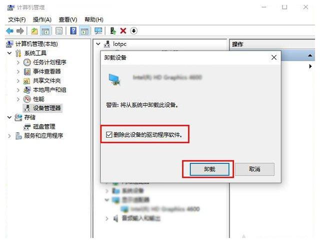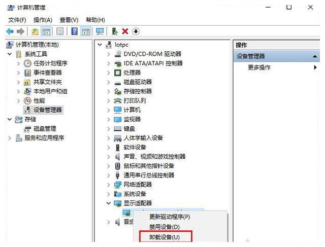 2、在计算机管理界面中,我们点击“设备管理器”,展开“显示适配器”,找到独立显卡设备,我们右键点击选择“卸载设备”,(如果您有独立显卡和集成显卡,如果分不清哪个是独立显卡还是集成显卡,可以将其都卸载,重新安装。)如下图所示。